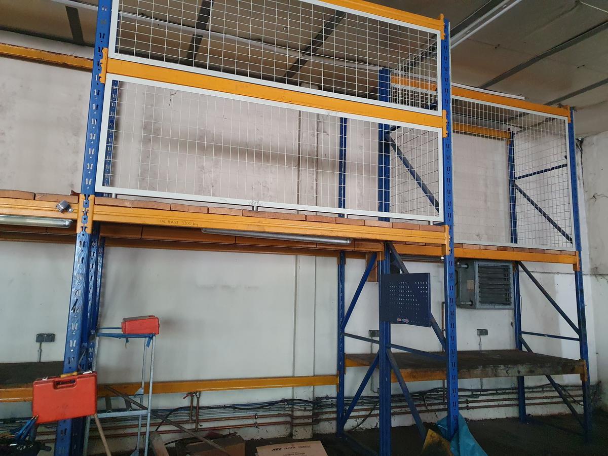 Schwerlastregal, ca. 10,12x2,12x4,15 m,mit Absicherungsgitter, 9 Steher, 29 Träger ( 270x10 cm)