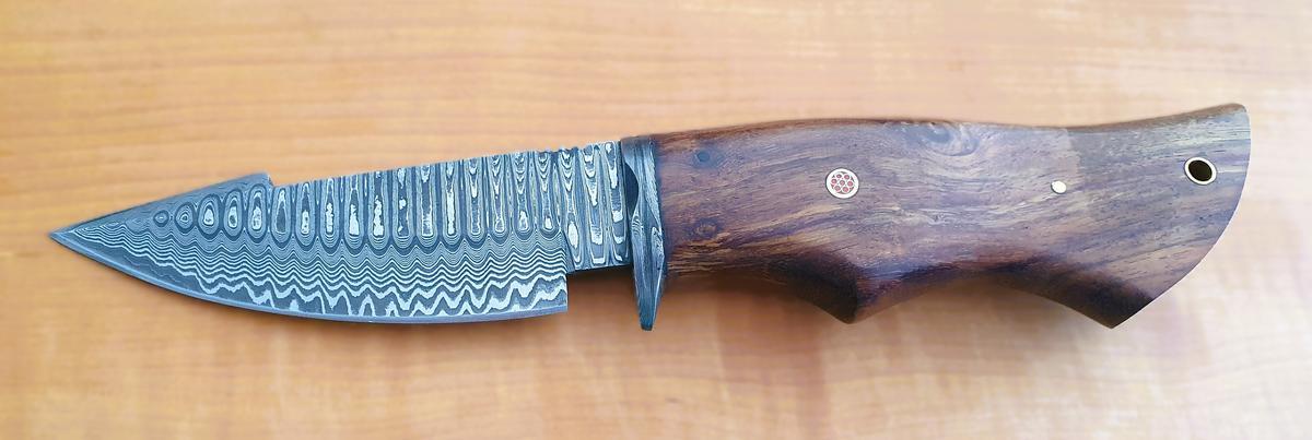 Damast Jagdmesser, Karbonstahl, rund 150 Lagen, charakteristische, rustikale Schmiedeoberfläche, Griff aus Holz, Gesamtlänge 260 mm, Klingenlänge 120 mm, Klingenstärke 4mm, Leder Messerscheide 165 mm Länge