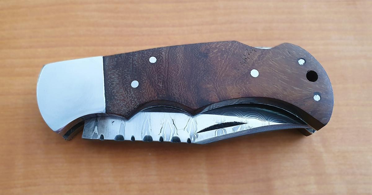Damast-Taschenmesser / Damast-Klappmesser, Holzgriff, Klinge Damaszener Stahl, rund 100 Lagen, charakteristische, rustikale Schmiedeoberfläche, Gesamtlänge (ausgeklappt) 170 mm, Gesamtlänge (eingeklappt) 100 mm, Klingenlänge 70 mm, Klingenstärke 3mm, Lede?d=2026-02-26 17:21:27