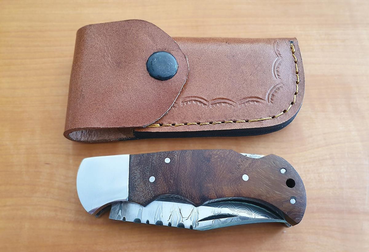 Damast-Taschenmesser / Damast-Klappmesser, Holzgriff, Klinge Damaszener Stahl, rund 100 Lagen, charakteristische, rustikale Schmiedeoberfläche, Gesamtlänge (ausgeklappt) 170 mm, Gesamtlänge (eingeklappt) 100 mm, Klingenlänge 70 mm, Klingenstärke 3mm, Lede?d=2026-02-26 17:21:24