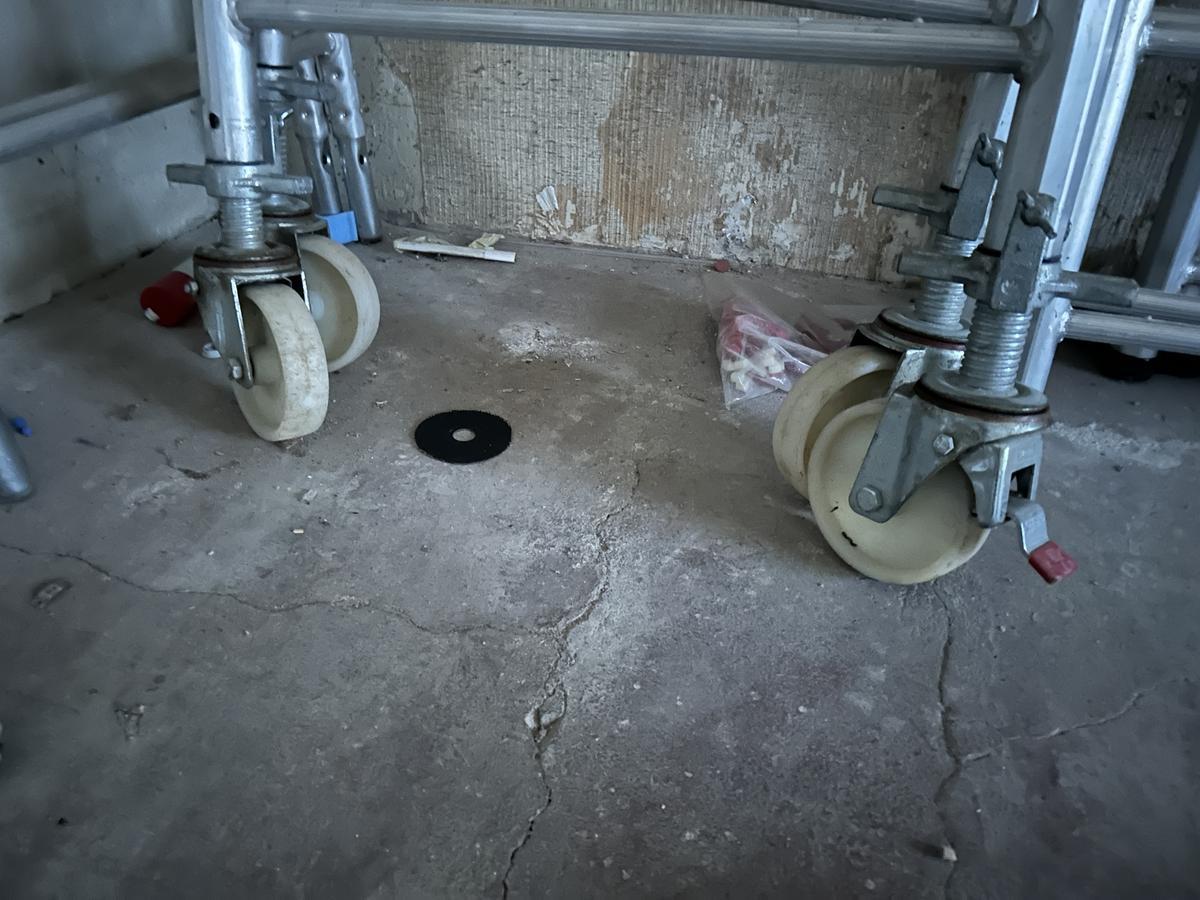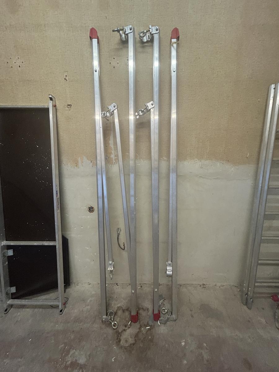 Beschreibung: 2 Seitenteile mit Rädern (brems- und nivellierbar) H 230, 2 Seitenteile H 210, 4 Seitenteile H 100, 2 Plattformen mit Durchstiegsklappe 200 x 60, 4 Y-Streben zur seitlichen Abstützung L 250, 4 Streben L 250, 10 Streben L 210