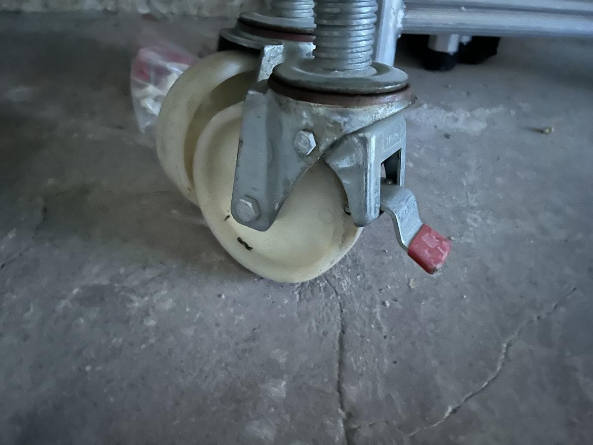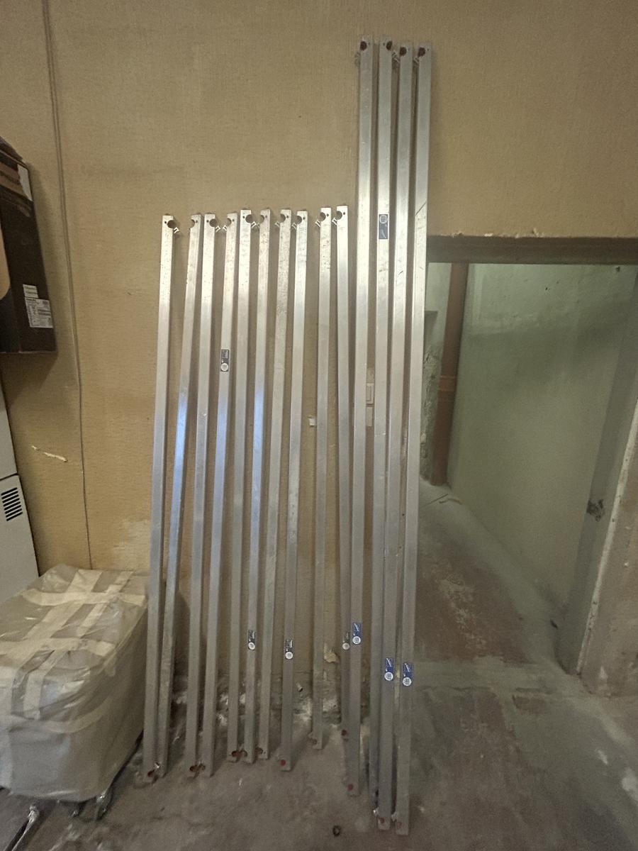 Beschreibung: 2 Seitenteile mit Rädern (brems- und nivellierbar) H 230, 2 Seitenteile H 210, 4 Seitenteile H 100, 2 Plattformen mit Durchstiegsklappe 200 x 60, 4 Y-Streben zur seitlichen Abstützung L 250, 4 Streben L 250, 10 Streben L 210