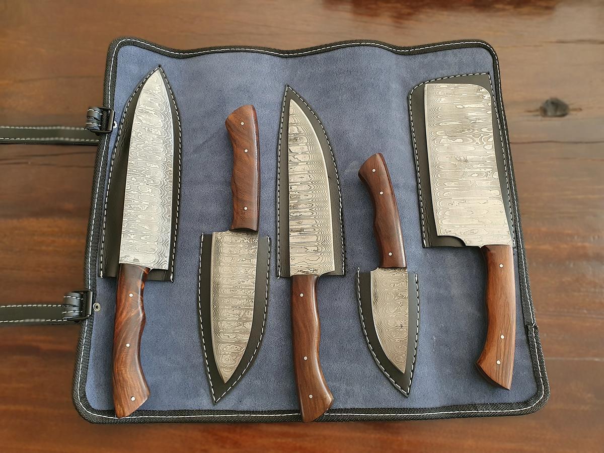Kochset mit 5 Damast-Messer und brauner Lederrolle, Klinge Damaszener Stahl, rund 150 Lagen, charakteristische, rustikale Schmiedeoberfläche, Griff Holz braun, Gesamtlängen 330 | 300 | 290 | 250 | 190 mm, Klingenlängen 200 | 180 | 160 | 130 | 90 mm, Kling?d=2025-12-23 14:48:56