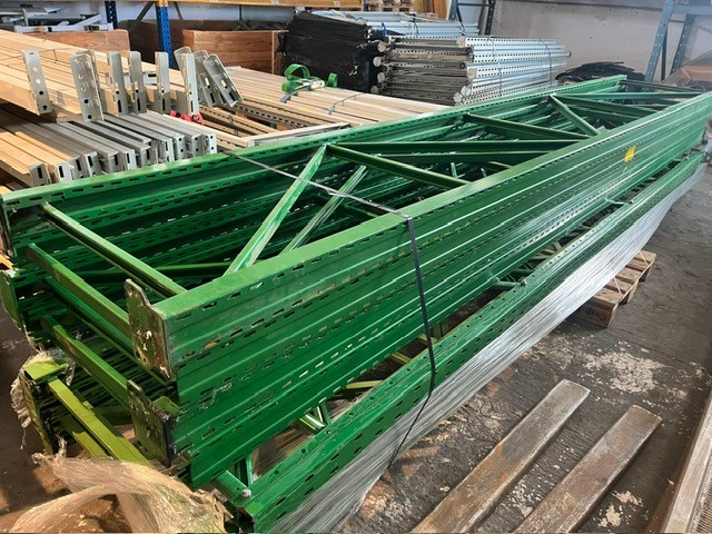 Beschreibung: Schwerlastregalsteher 4 Mal 450x80cm und 2 Mal 450x100cm, 5 Felder, 30 Balken, 800kg Nutzlast pro Palette