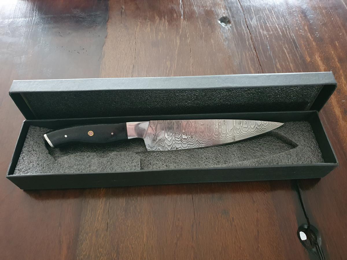 Damast-Kochmesser, Micarta-Griff schwarz, Klinge Damaszener Stahl, rund 150 Lagen, charakteristische, rustikale Schmiedeoberfläche, Gesamtlänge 310 mm, Klingenlänge 185 mm, Klingenstärke 3mm?d=2026-04-04 07:44:18
