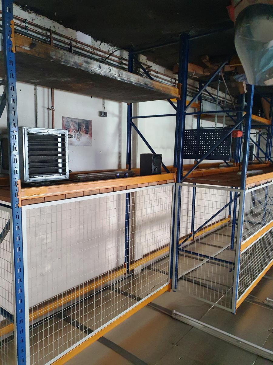 Schwerlastregal, ca. 10,12x2,12x4,15 m,mit Absicherungsgitter, 9 Steher, 29 Träger ( 270x10 cm)