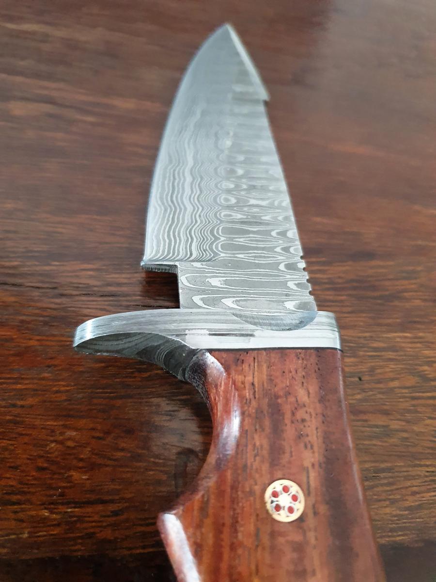 Damast Jagdmesser, Karbonstahl, rund 150 Lagen, charakteristische, rustikale Schmiedeoberfläche, Griff aus Holz, Gesamtlänge 260 mm, Klingenlänge 120 mm, Klingenstärke 4mm, Leder Messerscheide 165 mm Länge